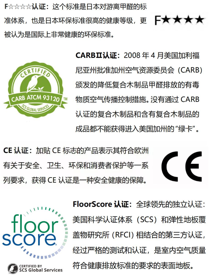 兔宝宝地板拥有五大国际认证,分别是FSC森林认证、美国CARBⅡ认证、国际FloorScore认证、日本大臣F4星认证、欧盟CE认证。